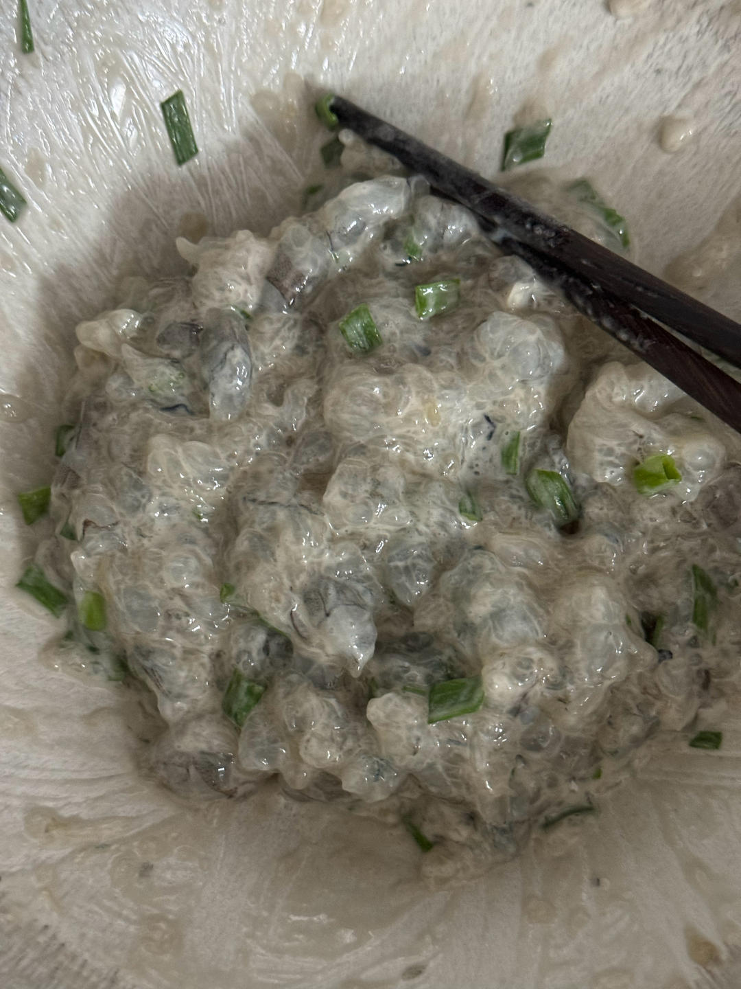 虾虾剁碎或者用料理机搅碎,之后加入一个鸡蛋的鸡蛋清和适量淀粉,顺时针搅拌,最好不要放葱花,会影响后期颜值,因为我踩雷了哈哈,等虾肉能立住一根筷子就说明上劲了,之后用手挤出一个个虾球,再去脆花粒里滚一下
