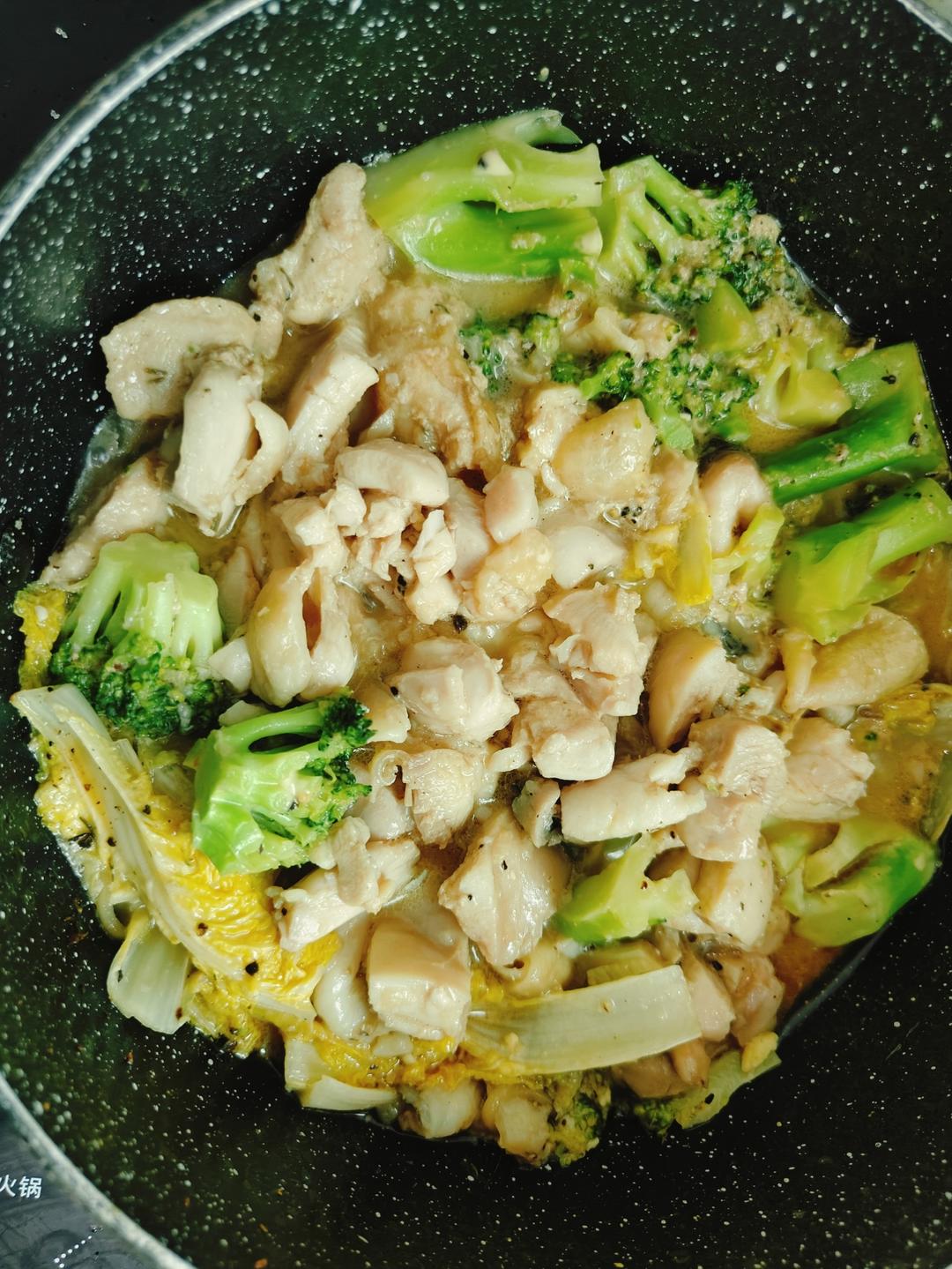 所有蔬菜切好放入锅中,鸡肉稍微清洗,整块放入锅中,鱼片直接放入锅中,电磁炉火候1200-1400,表面撒盐,放入酱油料酒砂糖(照烧汁)各2勺,以及百里香、黑胡椒碎,在鸡肉表面放入芝士片,盖上锅盖让鸡肉蒸熟,不用加入任何的水。