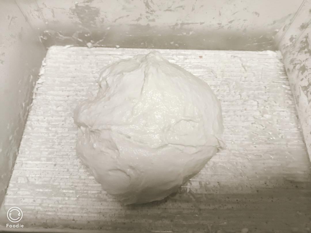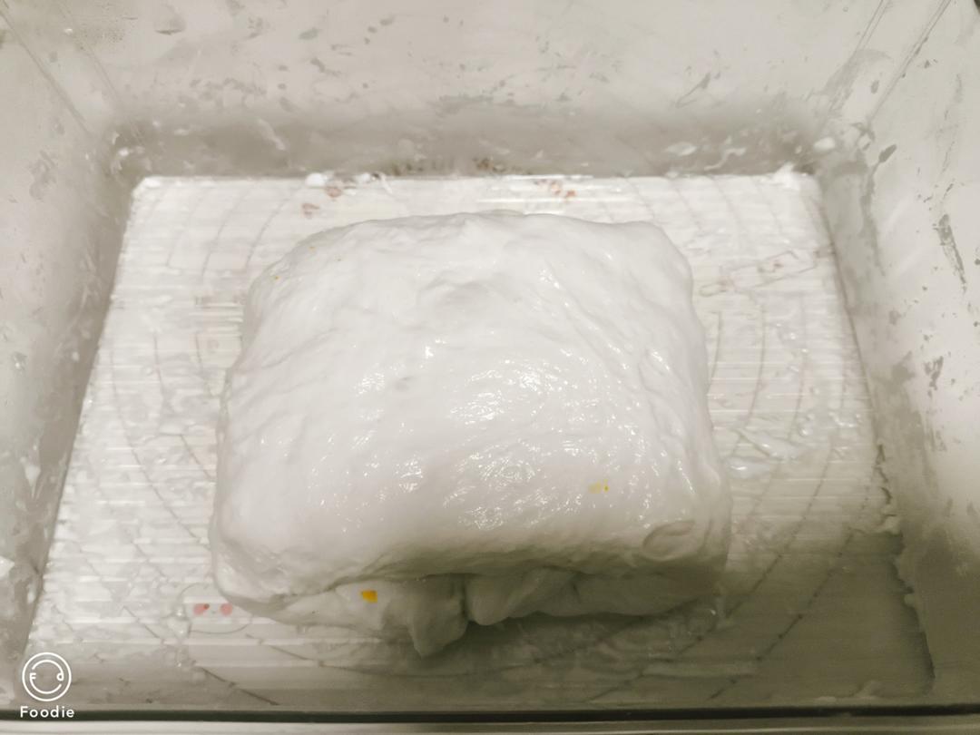 水合后水上沾水,进行第一次拉抻折叠。折叠好了,继续冰箱冷藏水合再折叠。一共折叠3次。最后一次折叠后冷藏水合40分钟。