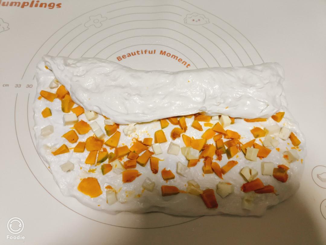 撒上切成小粒的南瓜和奶酪。