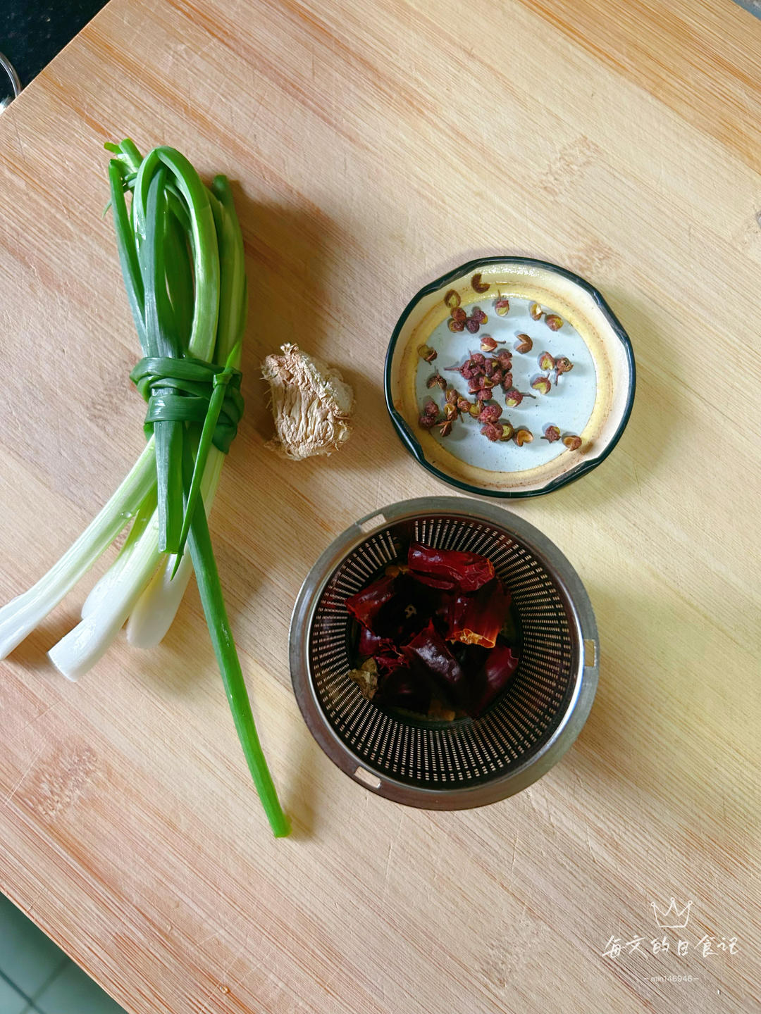 准备小葱5根(或者大葱1根也可以)、干辣椒4个、花椒30粒、姜1块(拍破)、白萝卜去皮切成块。