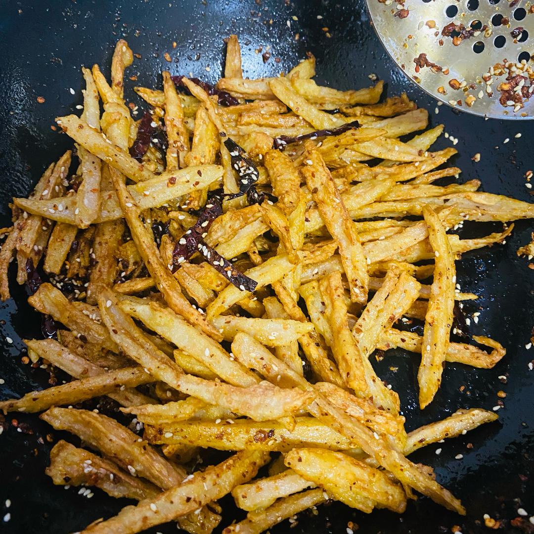 开火,倒入炸好的藕丝,翻炒均匀即可。