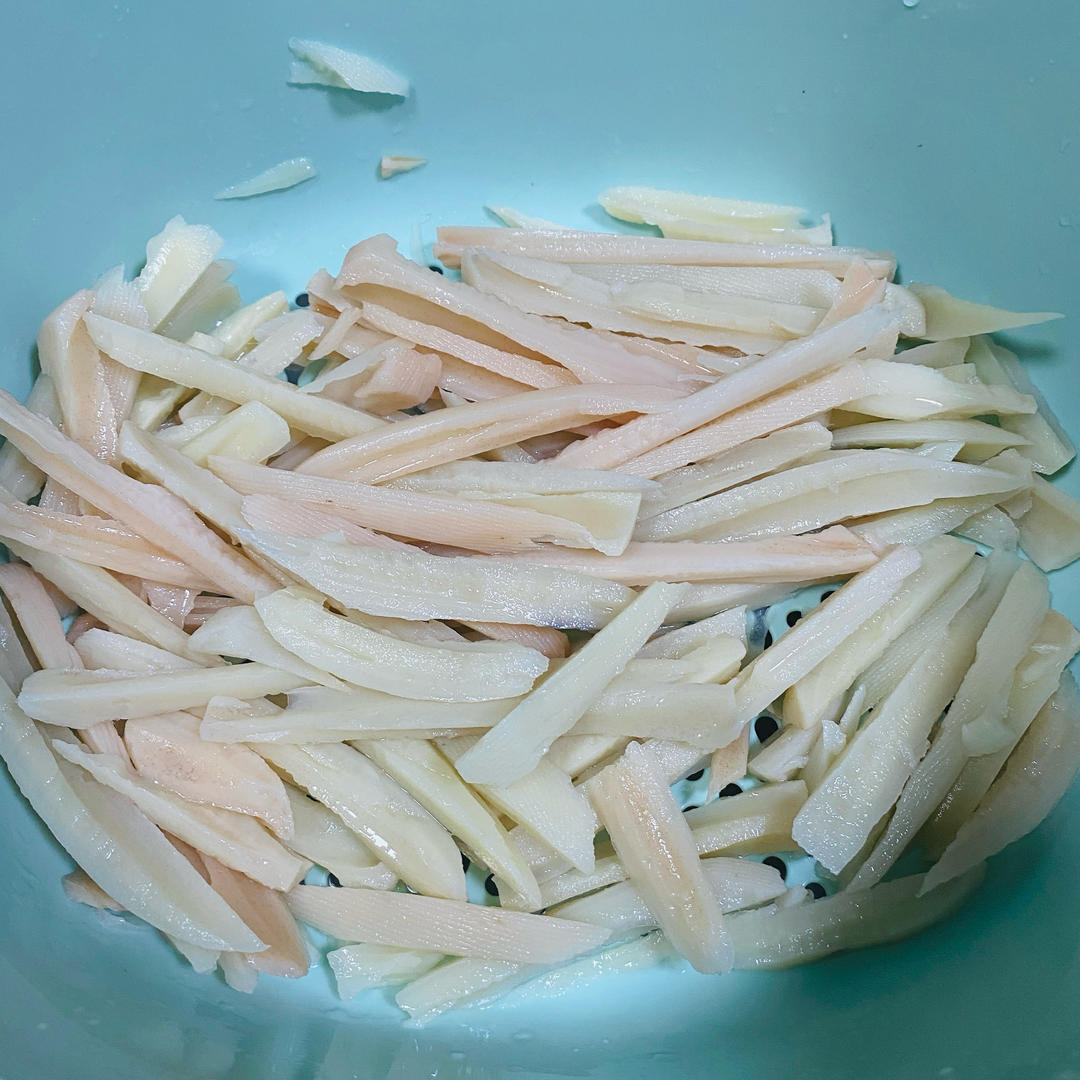 藕切成筷子大小的丝,锅中烧水,水开后倒入藕丝汆烫20秒,然后清水洗干净藕里面的泥巴,尽量沥干水分后备用。