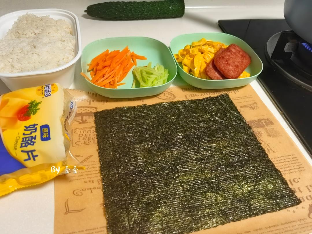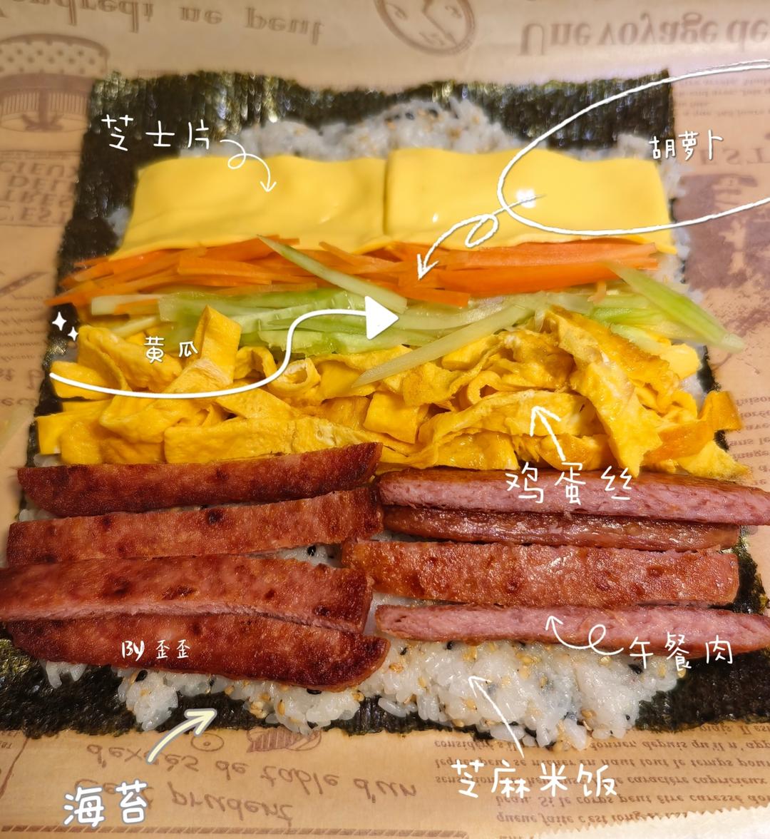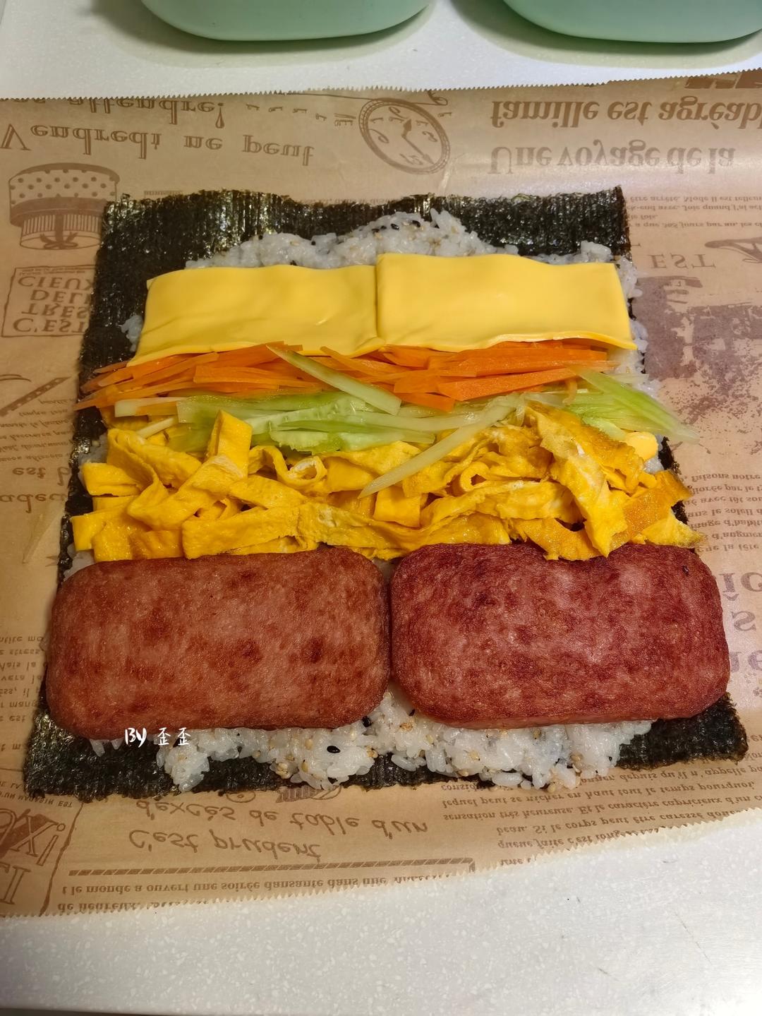 米饭上依次放午餐肉、鸡蛋丝、黄瓜丝、胡萝卜丝、奶酪片。