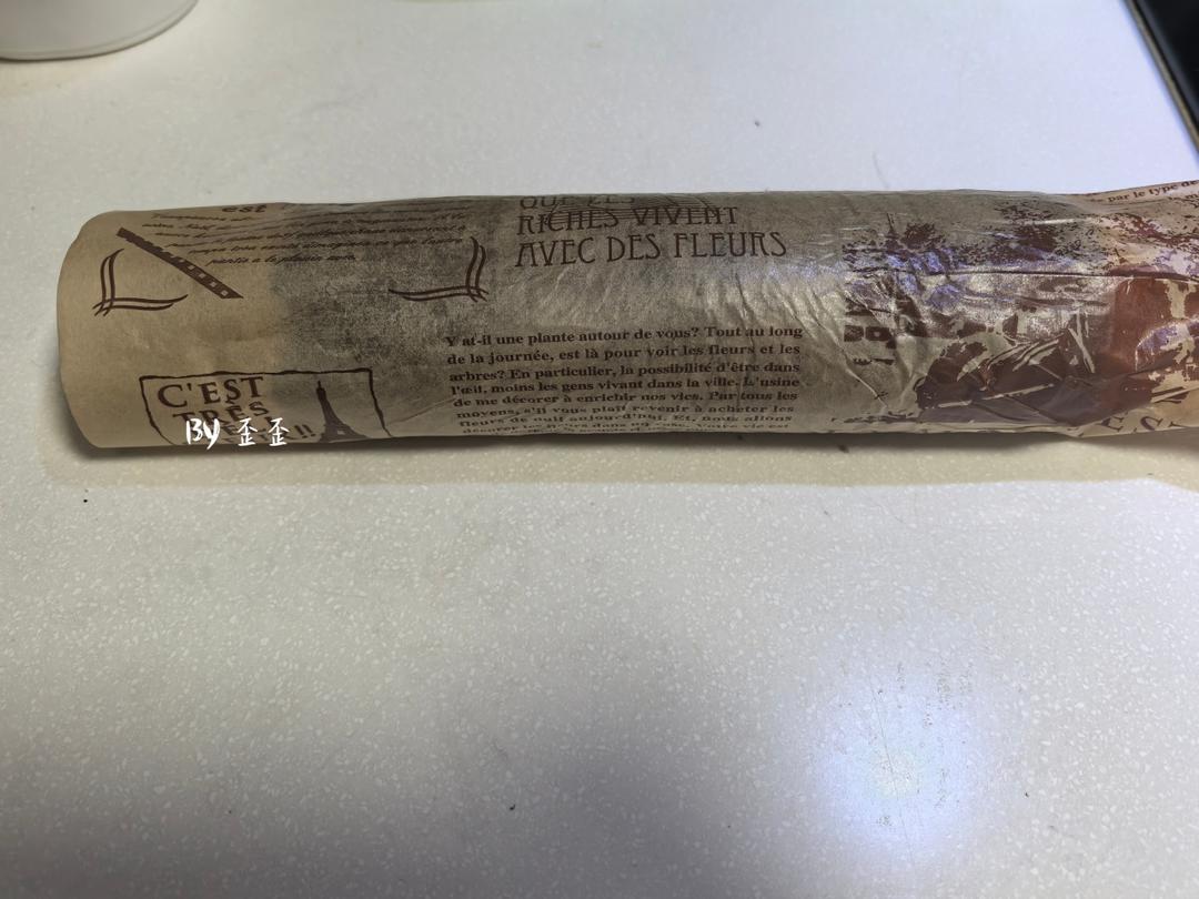 借助油纸把平铺的食材卷成一个饭卷,不会卷的手法可以参考卷蛋糕卷。