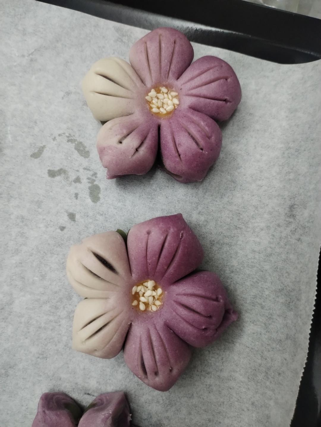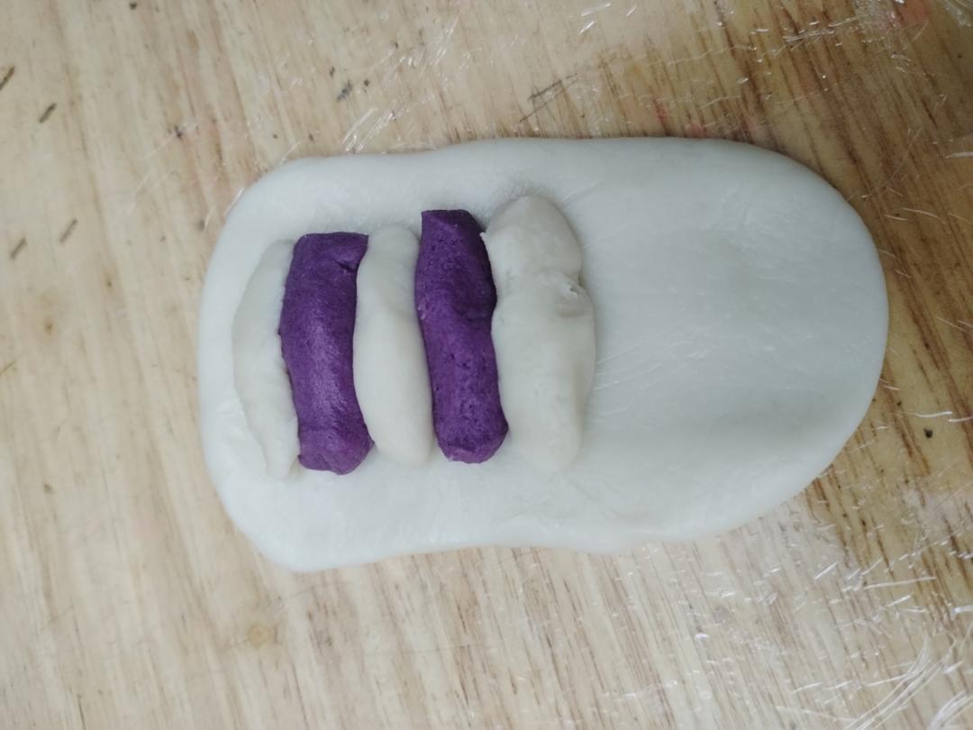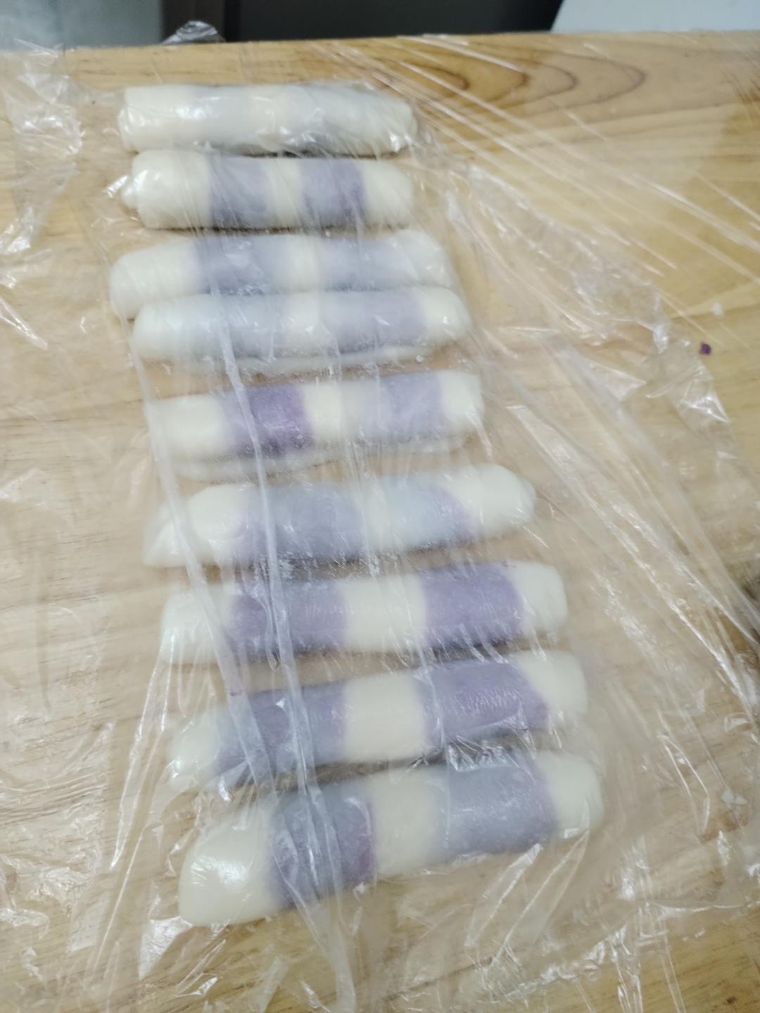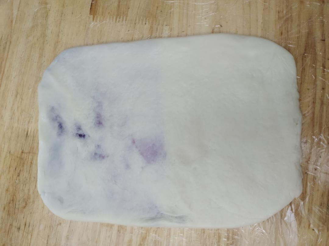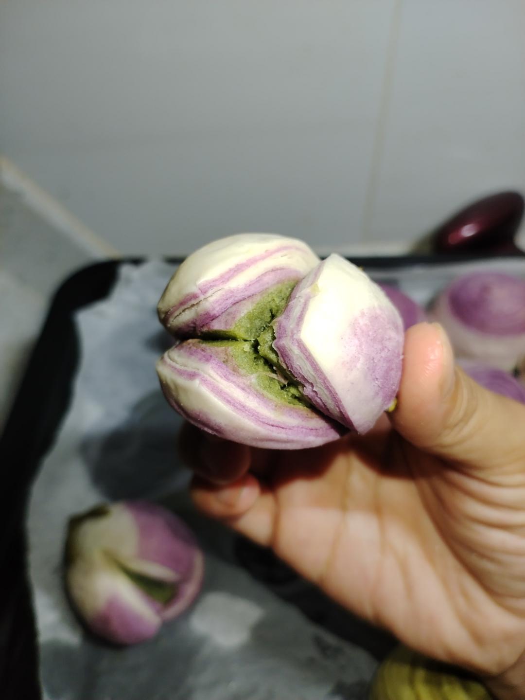 干油酥混合成面团,按照2:3调成紫色(加入紫薯粉)和白色。