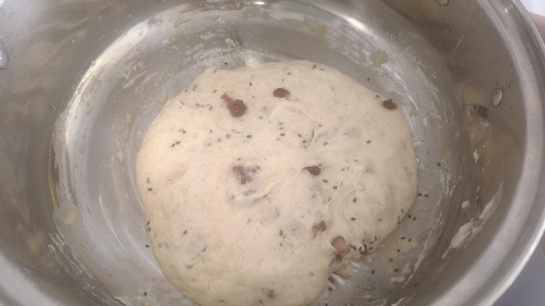温牛奶加酵母,搅拌至融化,等10分钟 后加入鸡蛋,搅拌均匀 面粉放在一个较大的容器里面备用,分3-4次放入牛奶蛋液,用刮刀搅拌成面团,会比较粘,如上图。 芝麻,蔓越莓干,可以先放在面团里 盖上盖子静待30min...