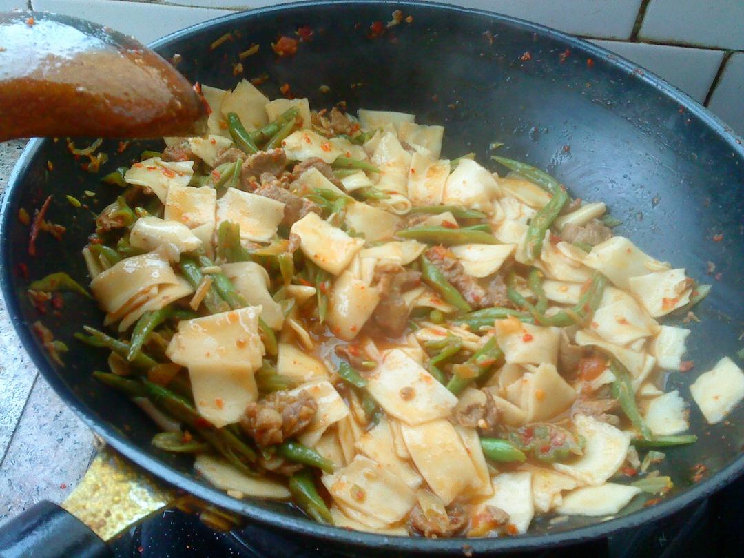 把煮熟的揪面片倒入羊肉豆角锅里翻炒就大功告成啦!