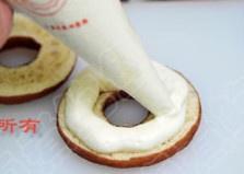 将面包圈从中片开,挤上一圈儿奶油奶酪糊
